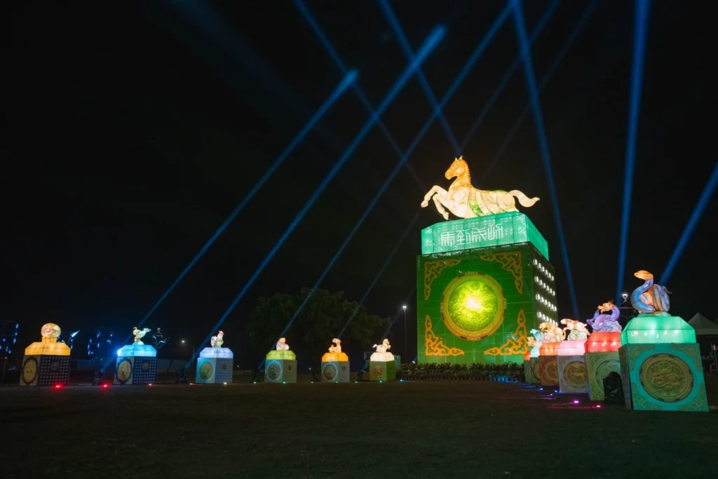 其中,今年最受矚目的亮點,莫過於以金門酒廠「馬年玉璽酒」為設計靈感打造的主燈作品「玉璽啟光・馬到成功」。主燈融合金門高粱文化與馬年奔騰意象,象徵祝福與希望,也被譽為「全台最醇的馬年主燈」,成為民眾爭相拍照的熱門地標。展期期間搭配燈光秀展演,為莒光共融公園夜空增添璀璨光彩。