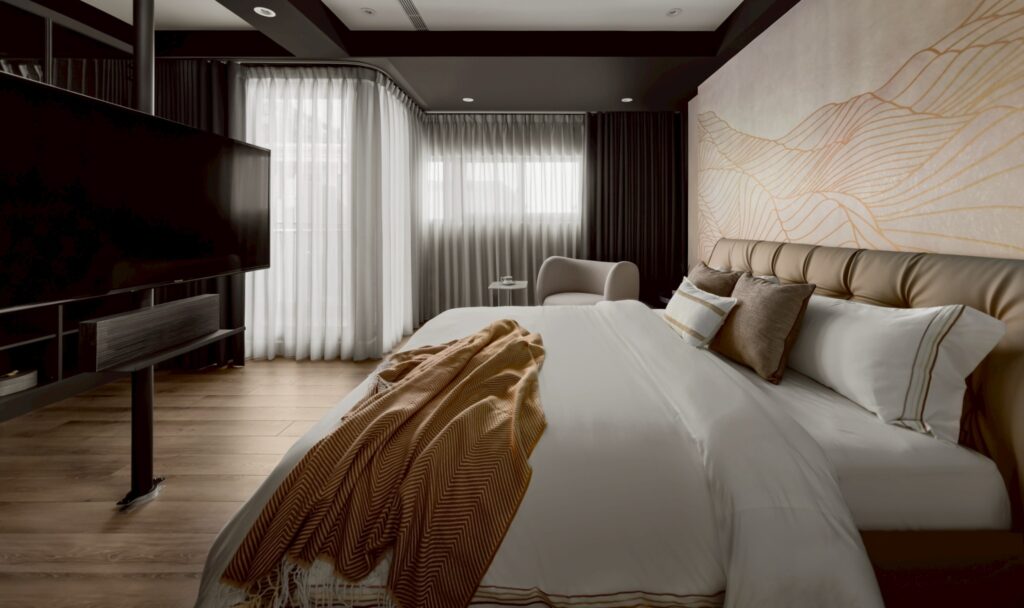 主臥以香檳棕色軟包床頭作為視覺起點,透過柔和側光與大量留白,降低空間的視覺負擔。地坪選用溫度較高的木質材料,與灰階背景形成和緩對比,使空間呈現安定調性。懸浮電視牆的設計使量體輕化,讓光線得以穿透,形成通透明亮的動線連續性。整體以低飽和度色彩建立空間的安靜基調,展現高度克制的設計態度與精品化的生活質地。