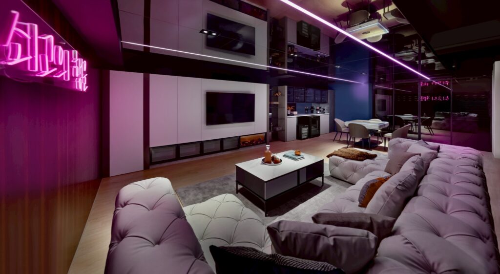 地下層作為屋主的接待與社交空間,以深色材質鋪陳背景,並藉由紫紅光影與鏡面天花建立戲劇張力,使空間呈現出具層次的視覺深度。場域規劃以「功能連續」為主軸:吧檯、餐敘與休憩區之間以開放式配置連接,讓聚會動線自然流動。家具則以包覆感強的沙發與低彩度材質定調,使光線成為塑造氛圍的主要語言,強化地下層的沉浸特質。
